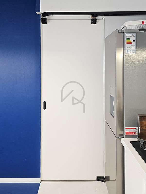 این پروژه یکی از چالشبرانگیزترین پروژههای رادنوسازه بود. به این دلیل که کافرما به دربی برای فضای آشپزخانه احتیاج داشت که علاوه بر ریلی بودن، نمای فریم لس زیبایی نیز داشته باشد. نکتهی مهم در اجرای این طرح، همباد بودن با دیوارهی کناری بود چرا که فضایی برای لولایی شدن آن فراهم نبود.